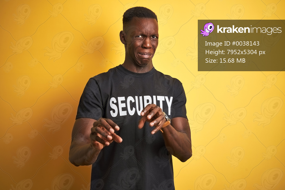African american safeguard man wearing security uniform over isolated yellow background disgusted expression, displeased and fearful doing disgust face because aversion reaction. With hands raised. Annoying concept. - Kraken Images