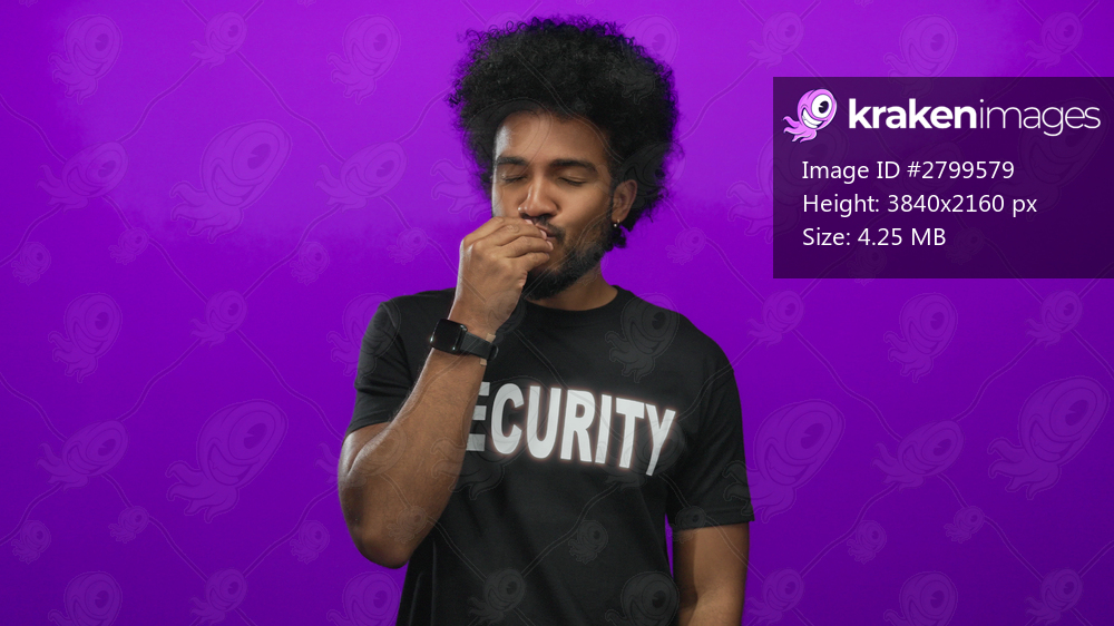 African american security man in a uniform smiling and waving in front of a vivid purple wall, embodying friendliness and professionalism in an isolated setting. - Kraken Images