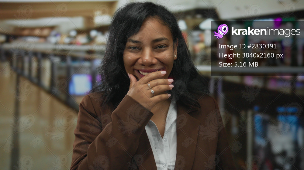 African american woman adjusts blazer lapel and smiles showing hand gesture in mall store; confidence empowerment.