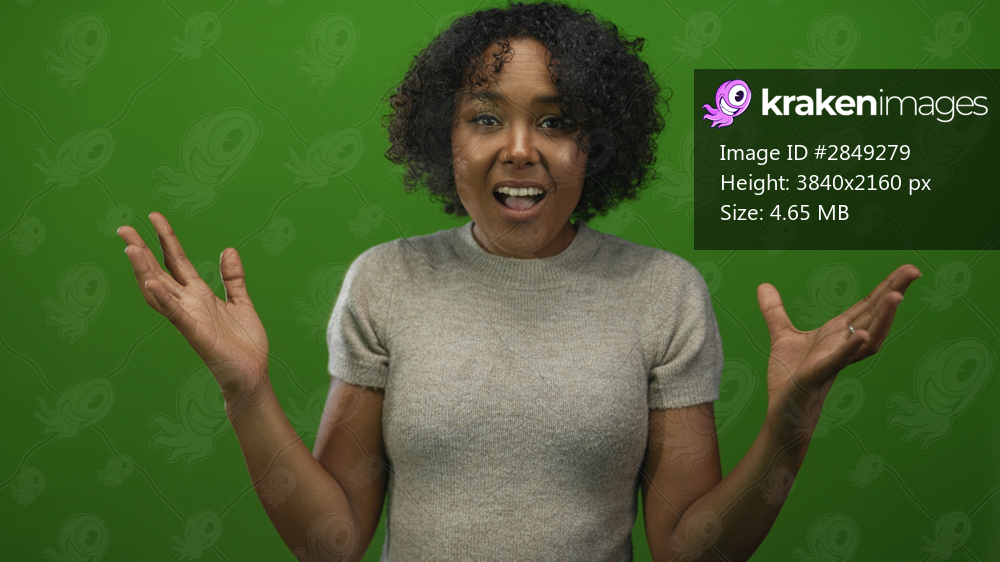 African american woman adjusts curly hair with focused expression in green studio medium shot closeup; curiosity.