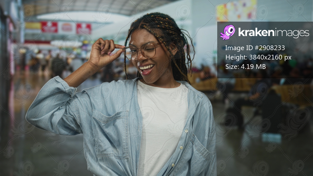 African american woman adjusts glasses and winks in busy airport terminal, smiling at camera; travel joy.