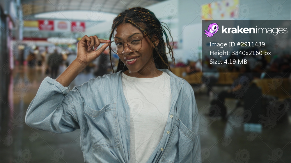 African american woman adjusts glasses and winks in busy airport terminal, smiling at camera; travel joy.