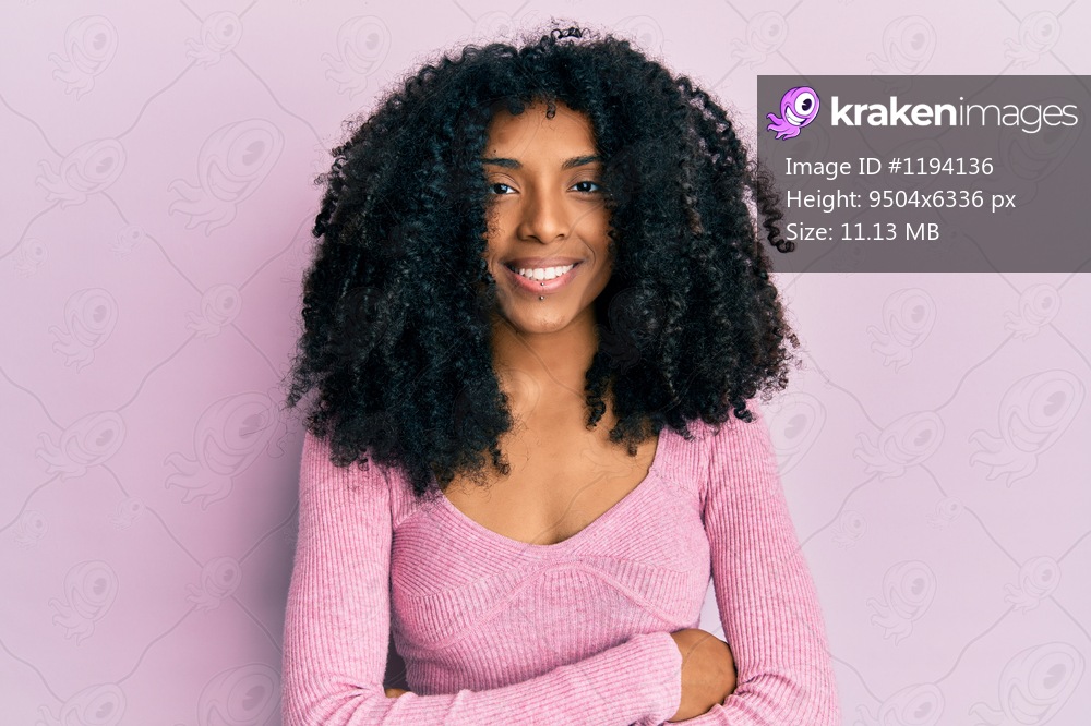 African american woman with afro hair wearing casual pink shirt happy face smiling with crossed arms looking at the camera. positive person.