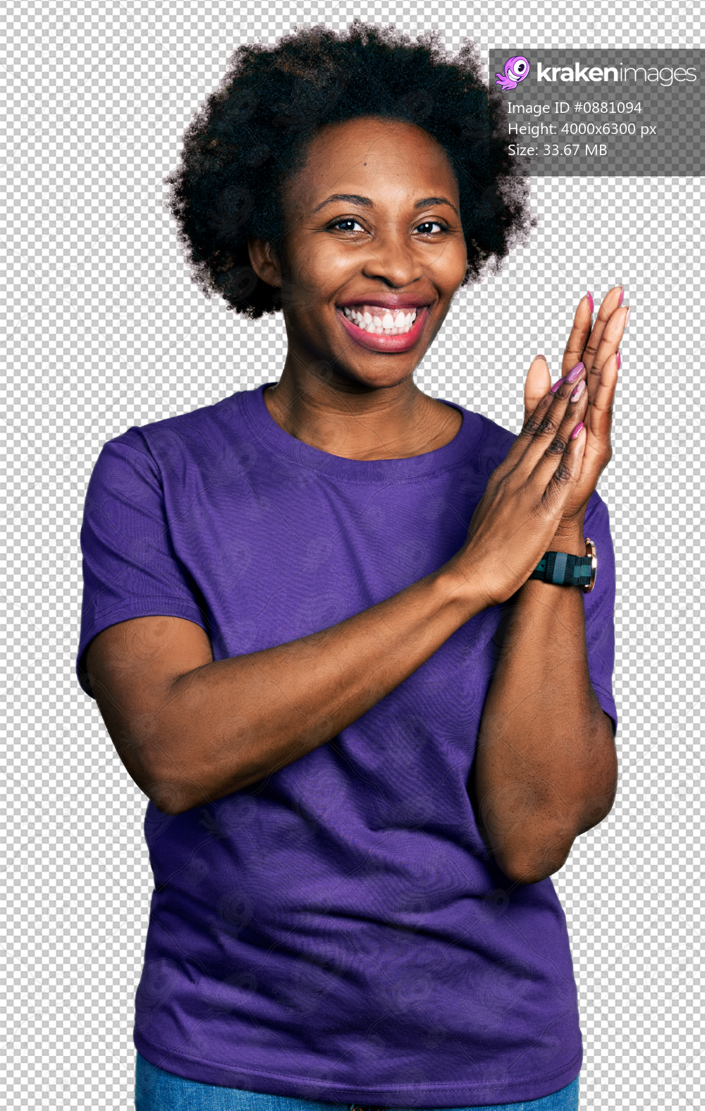 African american woman with afro hair wearing casual purple t shirt clapping and applauding happy and joyful, smiling proud hands together