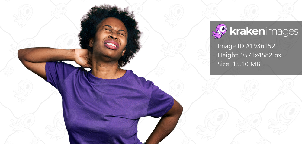 African american woman with afro hair wearing casual purple t shirt suffering of neck ache injury, touching neck with hand, muscular pain