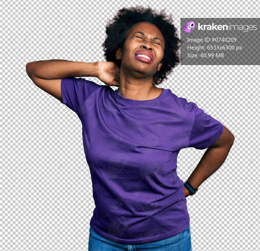 African american woman with afro hair wearing casual purple t shirt suffering of neck ache injury, touching neck with hand, muscular pain