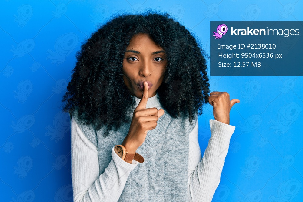 African american woman with afro hair wearing casual winter sweater asking to be quiet with finger on lips pointing with hand to the side. silence and secret concept. - Kraken Images