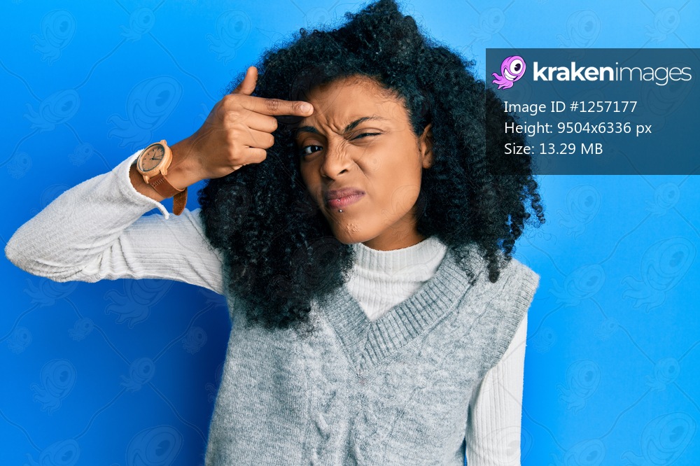 African american woman with afro hair wearing casual winter sweater pointing unhappy to pimple on forehead, ugly infection of blackhead. acne and skin problem - Kraken Images