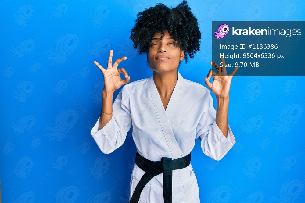 African american woman with afro hair wearing karate kimono and black belt relax and smiling with eyes closed doing meditation gesture with fingers. yoga concept. - Kraken Images