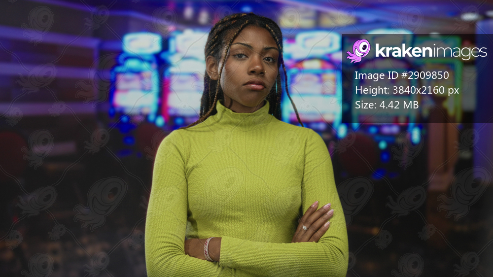 African american woman arms crossed facing slot machines in casino building; disappointment quiet resolve.