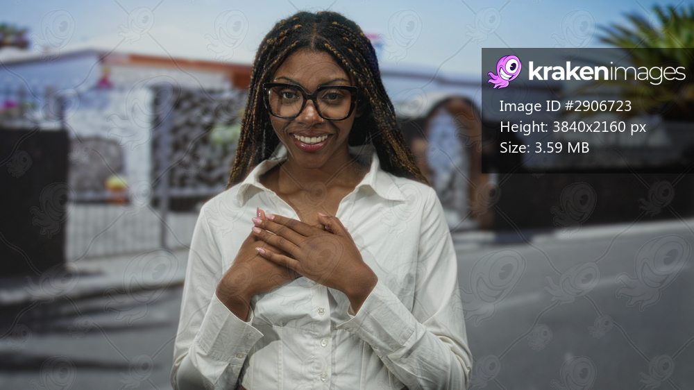 African american woman with braided hair and glasses, hands on chest gesture at a house entrance on a street; gratitude warmth.