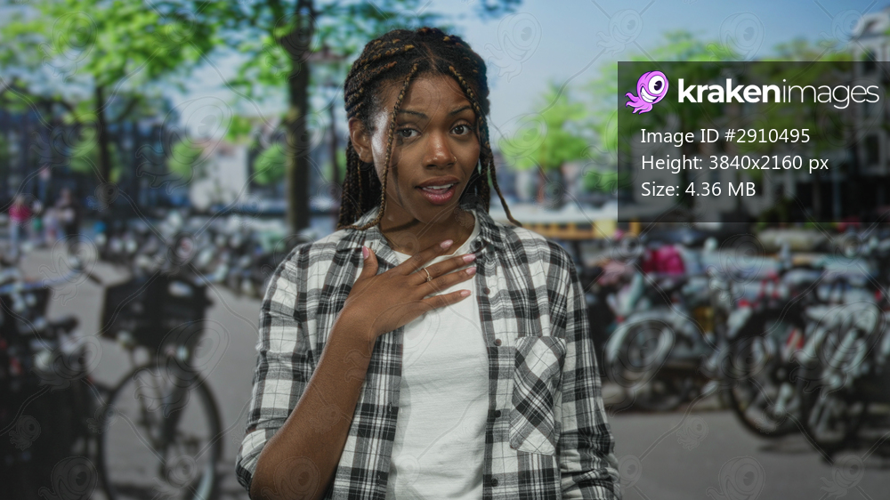 African american woman with braided hair hand on chest looking surprised on amsterdam street lined with bicycles; surprise apology.