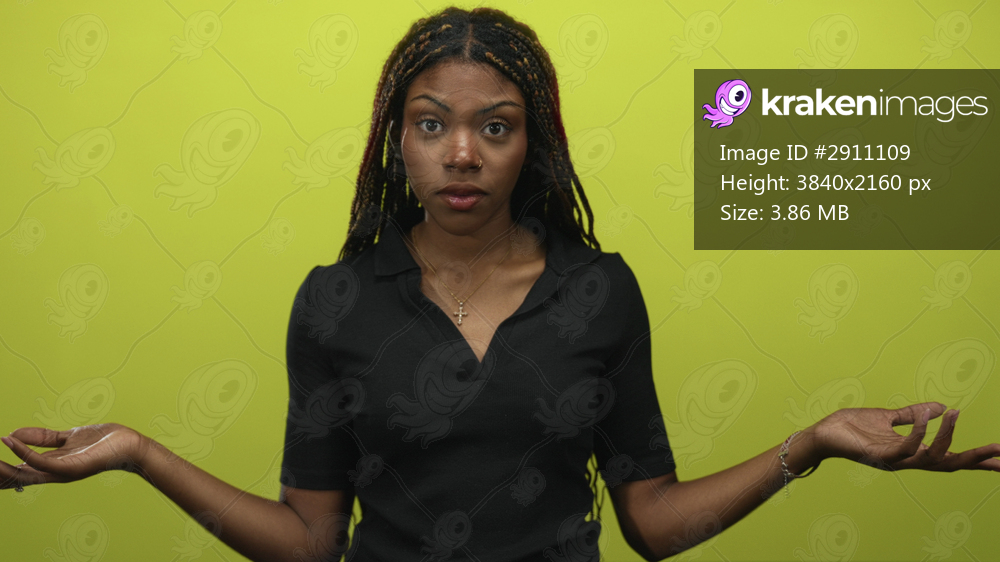 African american woman with braided hair and open palms shrugging in studio against lime green wall; confusion.