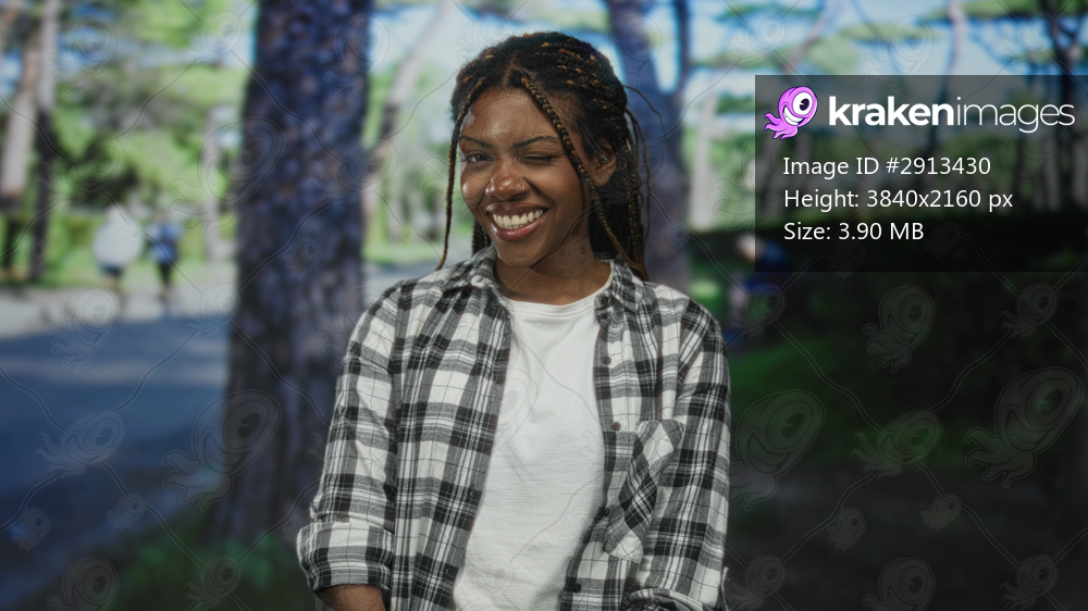 African american woman with braided hair smiling, hand raised pointing toward camera in park forest setting, wearing plaid shirt and white tee; confidence empowerment. - Kraken Images