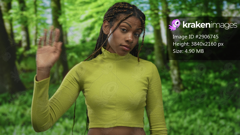 African american woman with braided hair waves hand in forest wearing green cropped turtleneck, facing camera with slight tilt; serene contemplation.