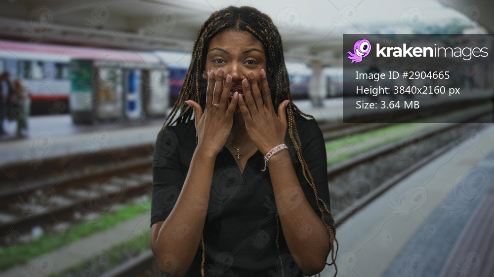 African american woman with braids smiling and gesturing with hands at train station platform, wearing cross necklace and black polo; joyful commute.