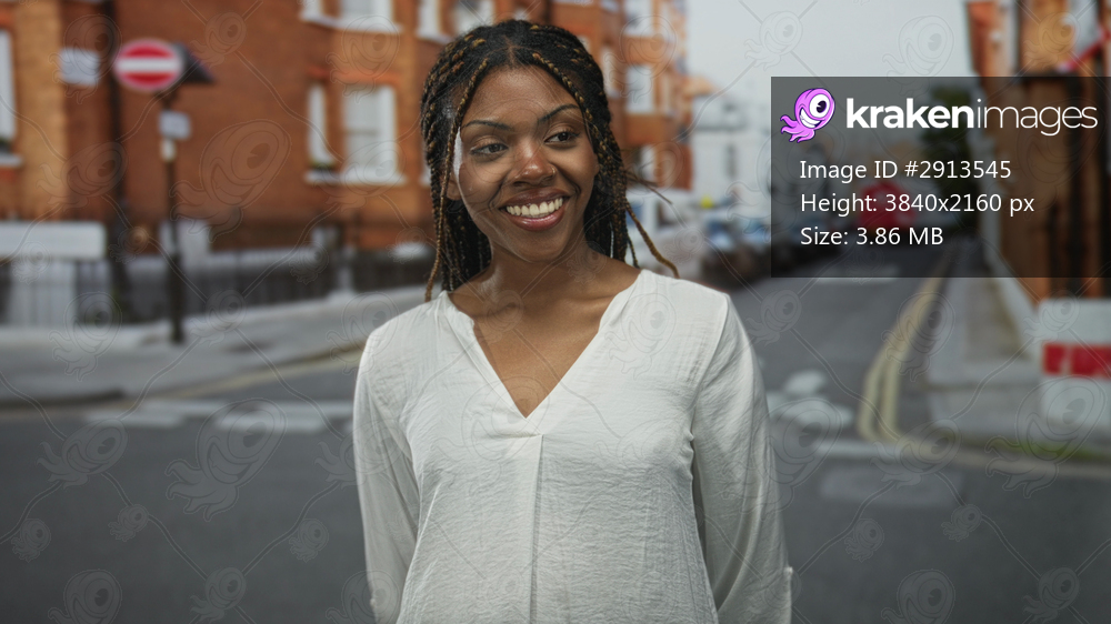 African american woman with braids smiling while standing on a city street, white blouse visible; joyful candid moment.