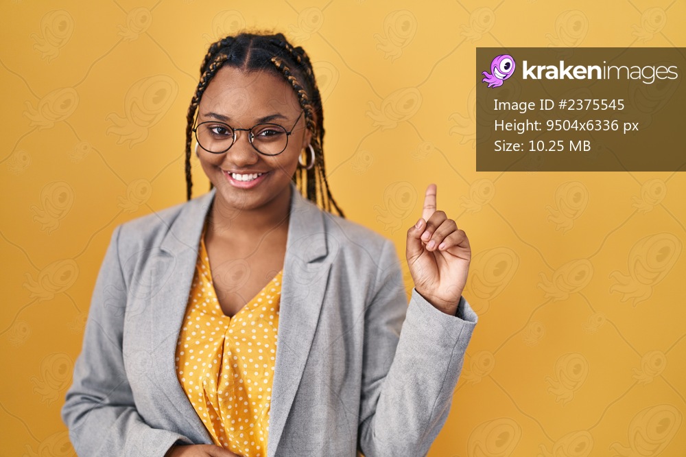 African american woman with braids standing over yellow background cheerful with a smile of face pointing with hand and finger up to the side with happy and natural expression on face - Kraken Images