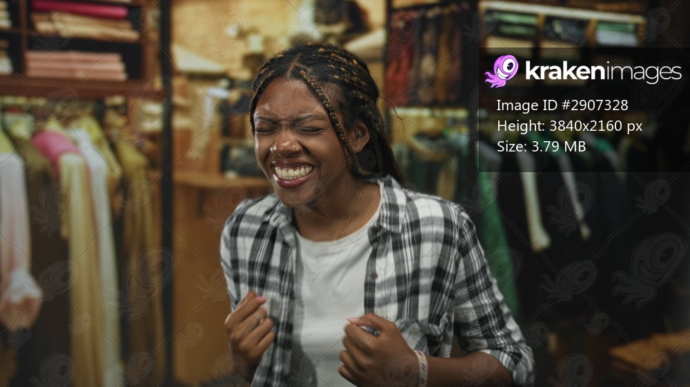 African american woman clenching fists and smiling in a shop wearing plaid shirt and white tee amid racks of jackets; joy celebration.