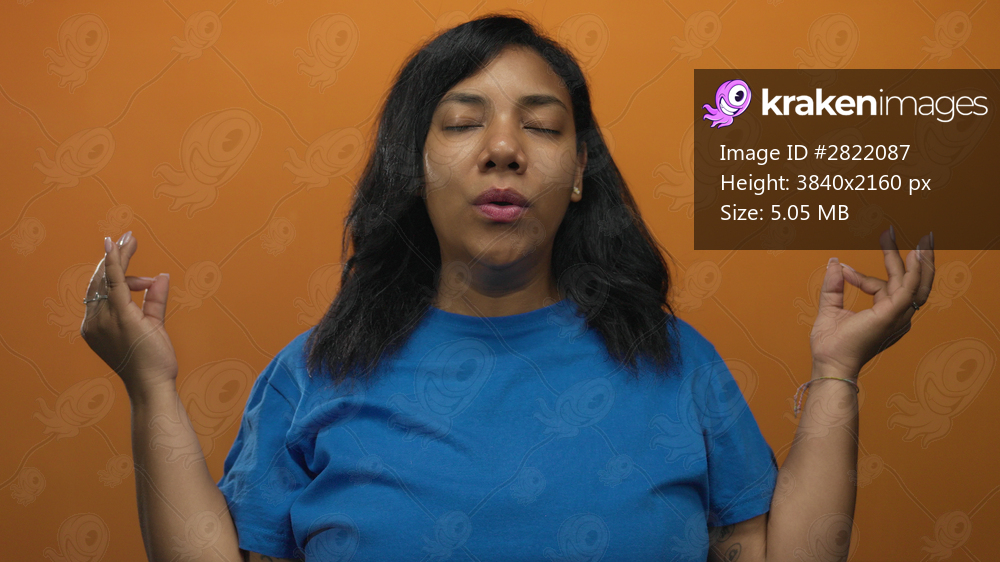 African american woman with closed eyes and hands forming ok sign on orange background in studio; serenity.