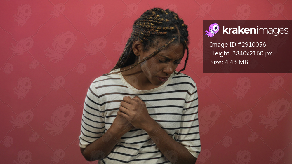 African american woman clutching chest with hands in a studio with pink wall wearing a striped shirt; pain vulnerability.