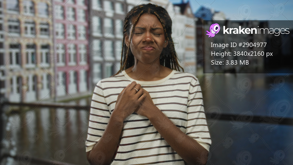 African american woman clutching hands to chest on canal bridge by historic building facades in amsterdam with eyes closed and pained expression; sadness longing. - Kraken Images