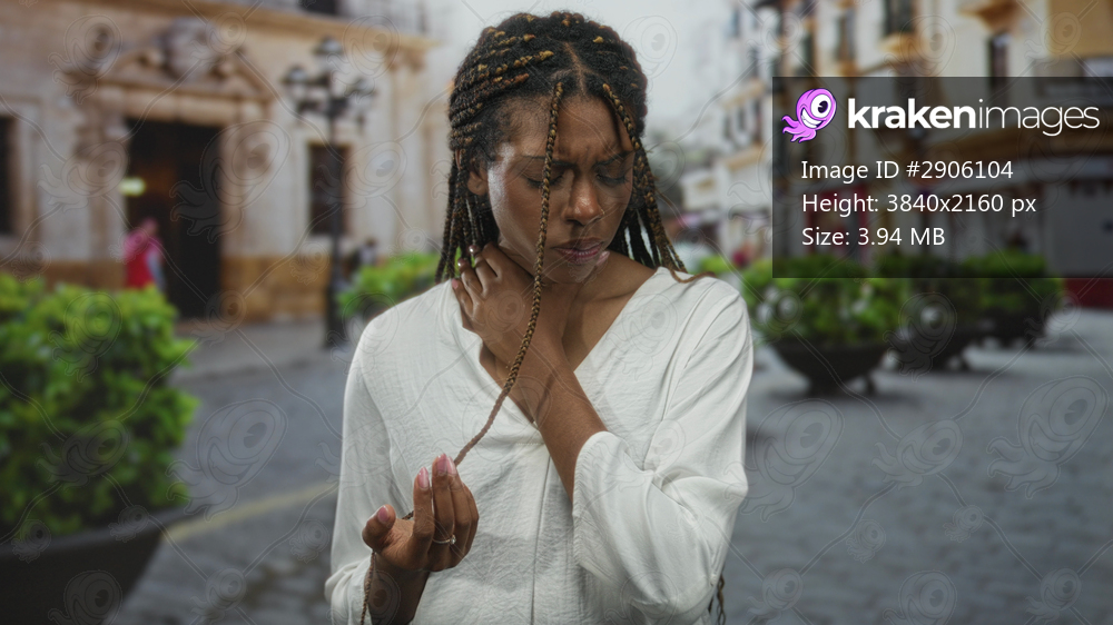 African american woman clutching throat and chest with hands on a cobblestone street; distress health emergency.