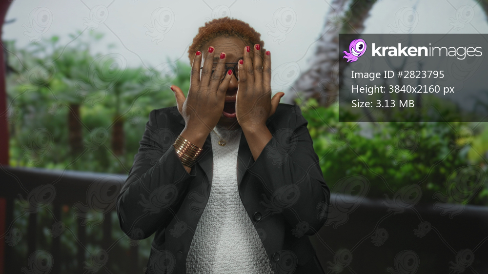 African american woman covers eyes with hands and opens mouth in forest; fear vulnerability uncertainty.