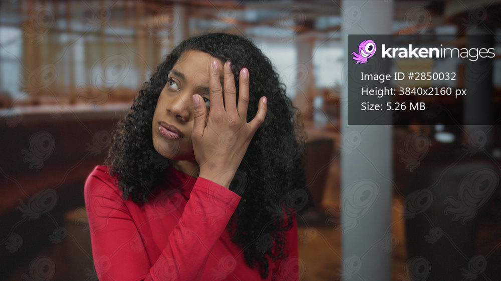 African american woman covers face with hand in dimly lit quiet restaurant building; stress reflection.