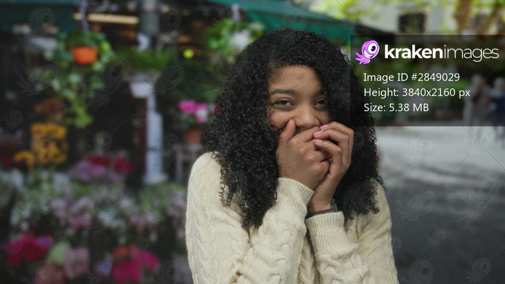 African american woman covers mouth with hands and leans beside fresh flower stand at outdoor market; coy delight.