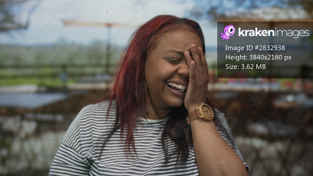 African american woman covers mouth laughing on restaurant terrace building outdoors; lighthearted joy.