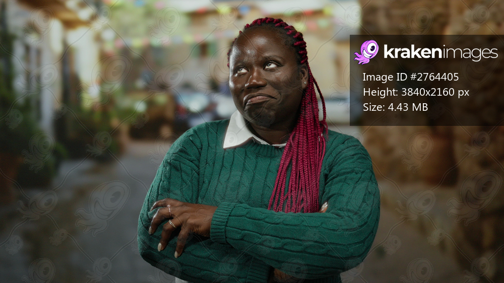 African american woman with crossed arms smiling confidently in an outdoor city street scene, wearing a green sweater and showcasing vibrant red hair.