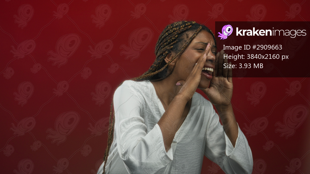African american woman cupping hands around mouth shouting in studio with vivid red backdrop, wearing white blouse and braids; protest urgency.