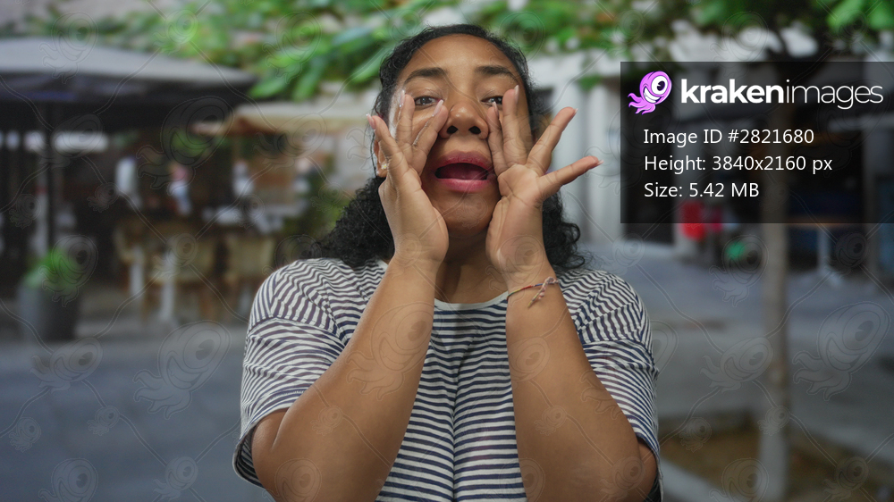 African american woman cups hands around mouth and shouts on street under tree canopy and umbrellas behind her; urgency.