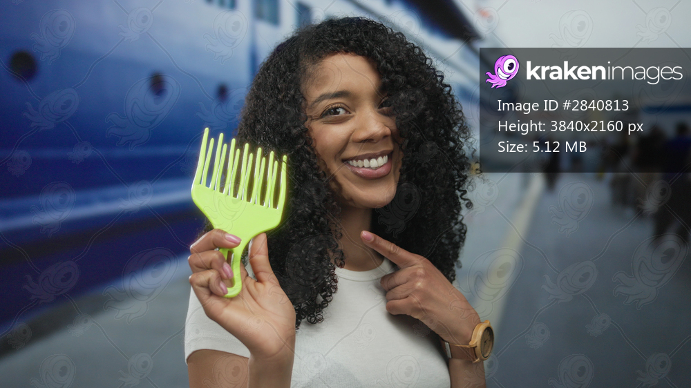 African american woman with curly hair holds bright green pick comb and points finger to comb on street; confidence.