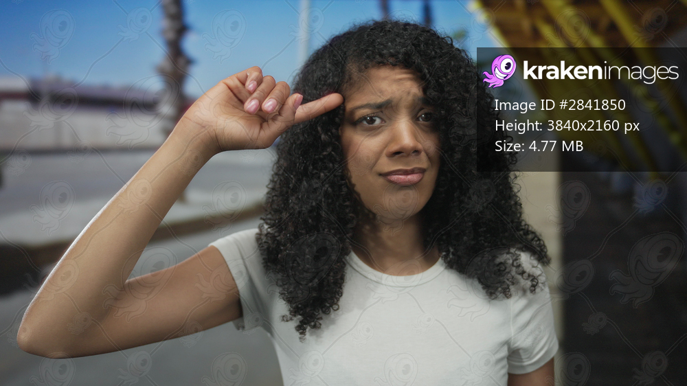 African american woman with curly hair in white shirt pointing finger to head on sunlit city street; doubt.