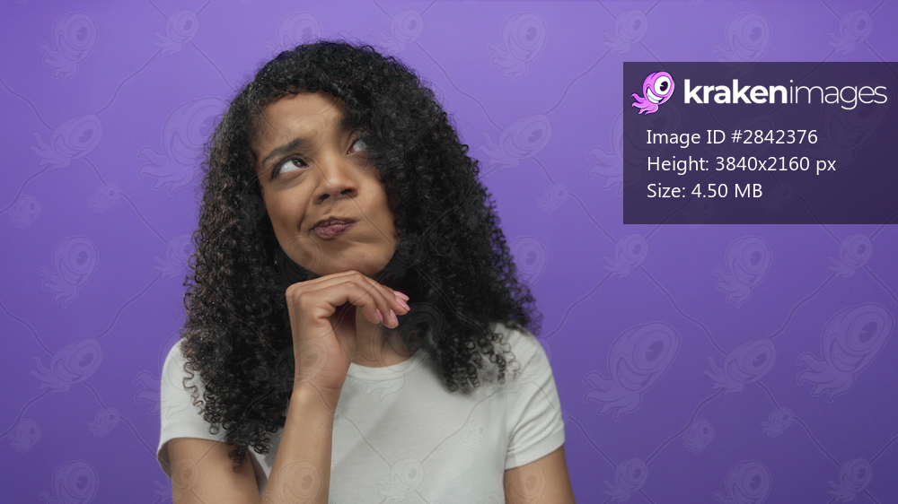 African american woman with curly hair looks upward with hand on chin in studio; thought doubt contemplation introspection.