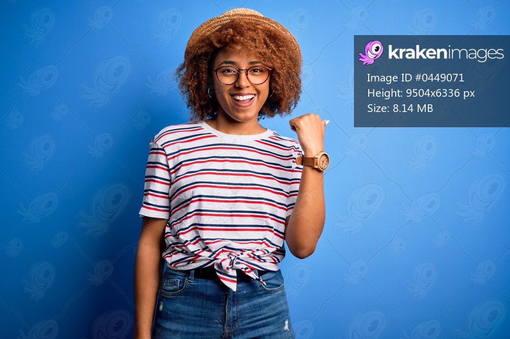 African American woman with curly hair on vacation wearing summer hat and striped t-shirt smiling with happy face looking and pointing to the side with thumb up. - Kraken Images