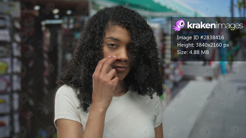 African american woman with curly hair pinches nose beside souvenir kiosk on sunny city street; disgust.
