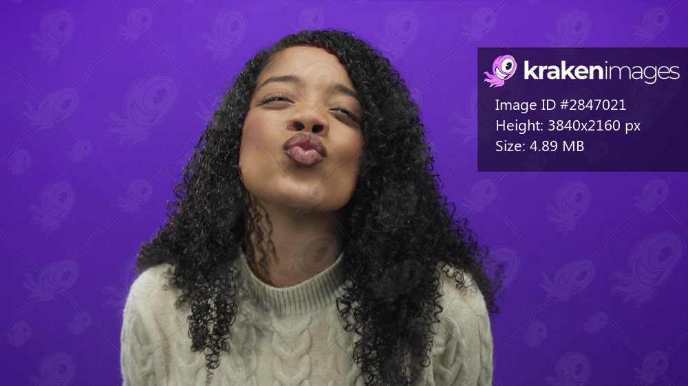African american woman with curly hair puckering lips and tilting head against purple studio wall; affection intimacy.