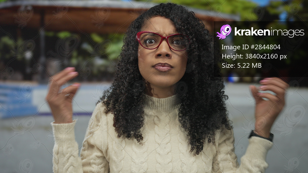 African american woman with curly hair and red glasses shrugs hands in forest setting under wooden shelter; confusion frustration perplexity uncertainty. - Kraken Images