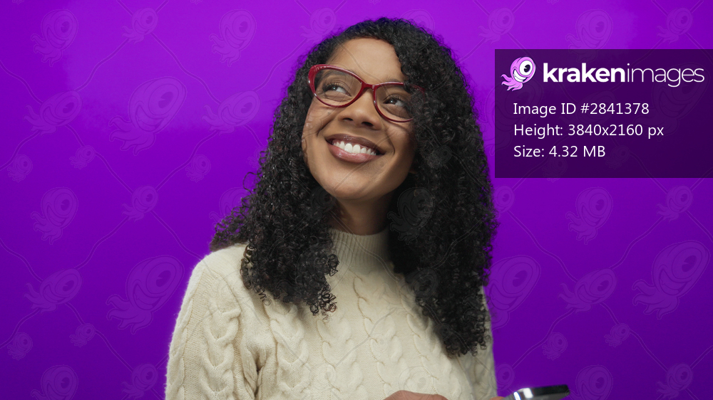 African american woman with curly hair wearing red eyeglasses holding smartphone in studio with purple wall; happiness.