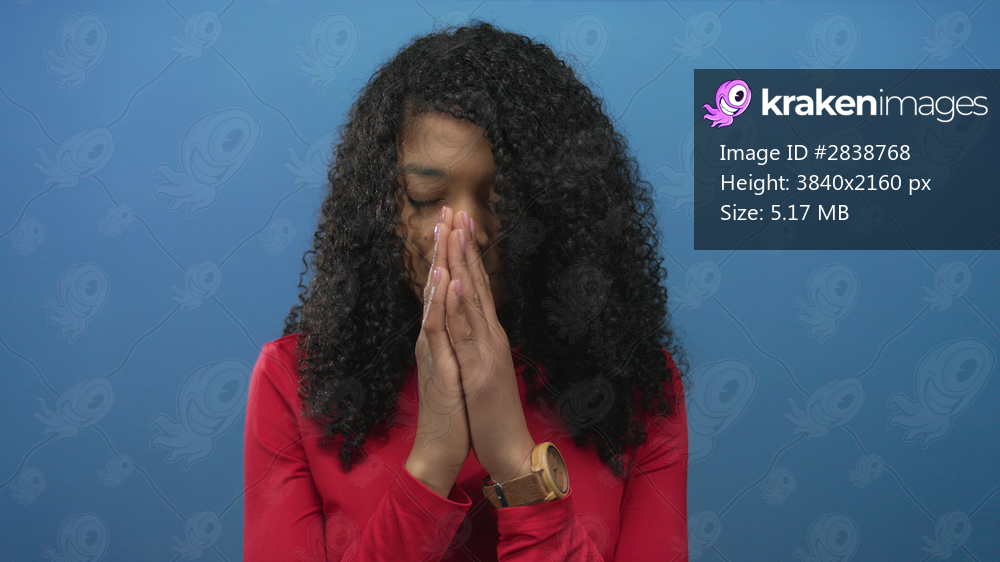 African american woman with curly hair wearing red top presses hands together praying in studio; serenity.