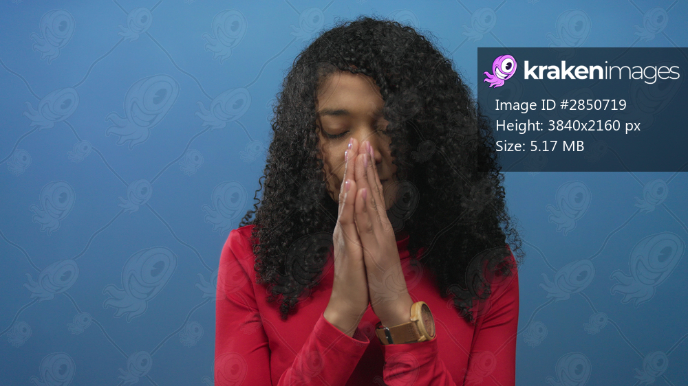 African american woman with curly hair wearing red top presses hands together praying in studio; serenity.