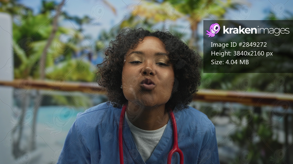 African american woman doctor in blue scrubs makes finger heart and blows kiss to camera in studio; affection.