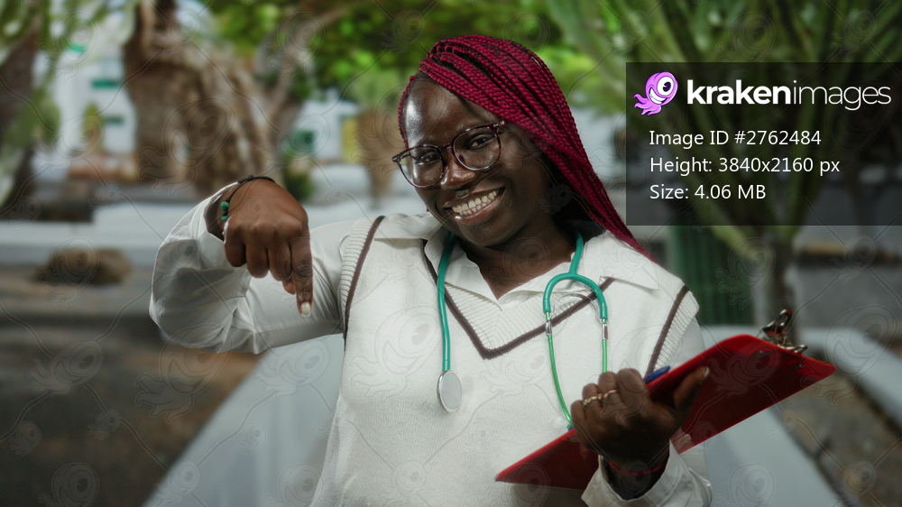 African american woman doctor with red braids smiling and pointing down while holding clipboard in a green park wearing a stethoscope.