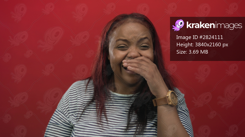 African american woman face laughing with hand covering mouth in studio with bright red background; joy.