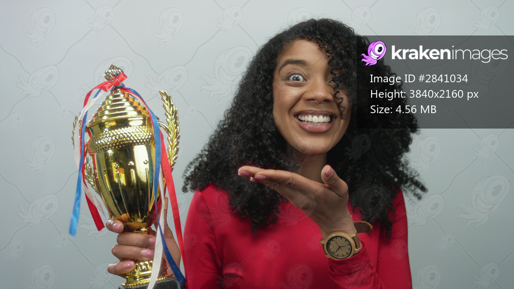 African american woman firmly holds golden trophy with ribbons and raises fist in light grey studio; joy victory.