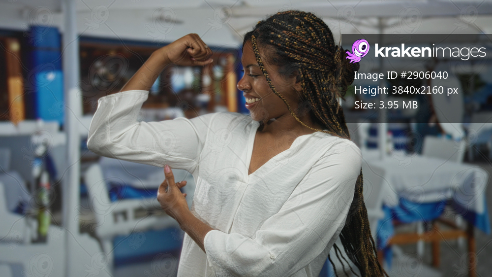 African american woman flexes arms and smiles on a terrace building dining area with umbrellas and tables; confidence empowerment.