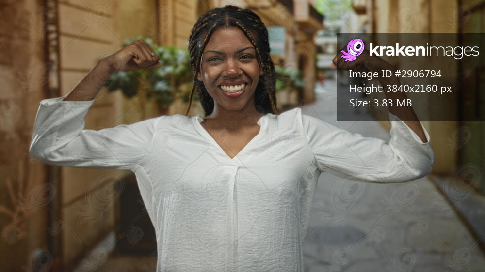 African american woman flexes biceps and points finger to bicep in old town street; confidence strength.